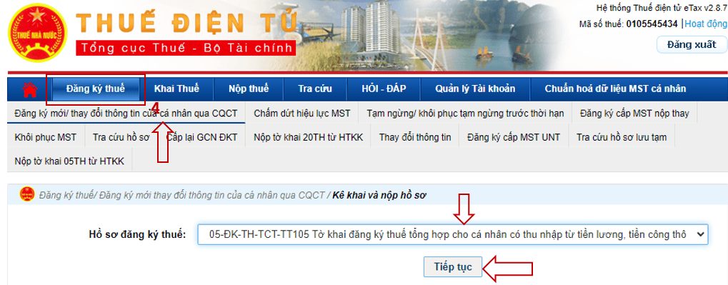 Bước 4:Nhấn chọn mục “Đăng ký thuế”. Giao diện mới mở ra tại mục “Đăng ký mới thay đổi thông tin của cá nhân qua CQCT” chọn hồ sơ “05-ĐK-TH-TCT”, bấm chọn “ Tiếp tục”\