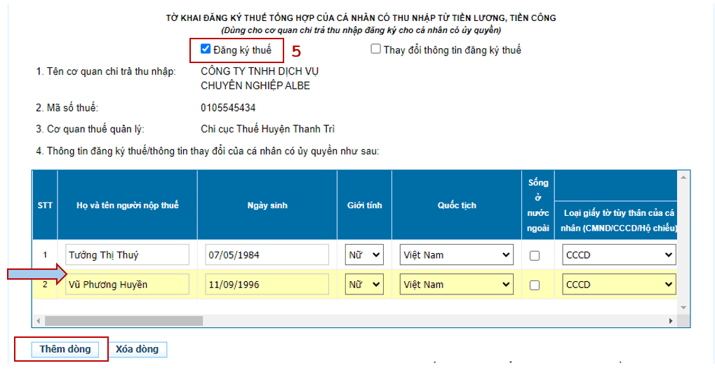 Lưu ý: Nếu muốn làm đăng ký cho 2 người trở lên. Bạn chọn ô “Thêm dòng” và thao tác như người đầu tiên.